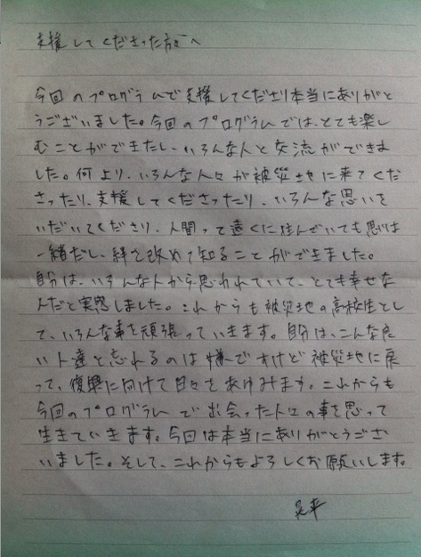 「一人じゃないよ。いつも貴方の事を応援している。だからみんなで一緒にがんばろうね!」っていうメッセージはちゃんと伝わったと思います。子どもたちがご支援いただいた方々にお手紙をおいていってくれましたので、是非読んでください。